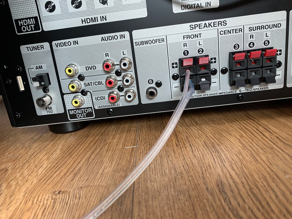 2-1-2 대부분의 스피커 연결 방법은 동일하며, 스피커 뒷면에 있는 나사 같은 것을 돌려서 분리하고, 피복한 스피커 케이블의 심을 손으로 잘 돌려서 삽입 시 케이블 심들이 벌어지지 않도록 돌려서 잘 말아주세요!